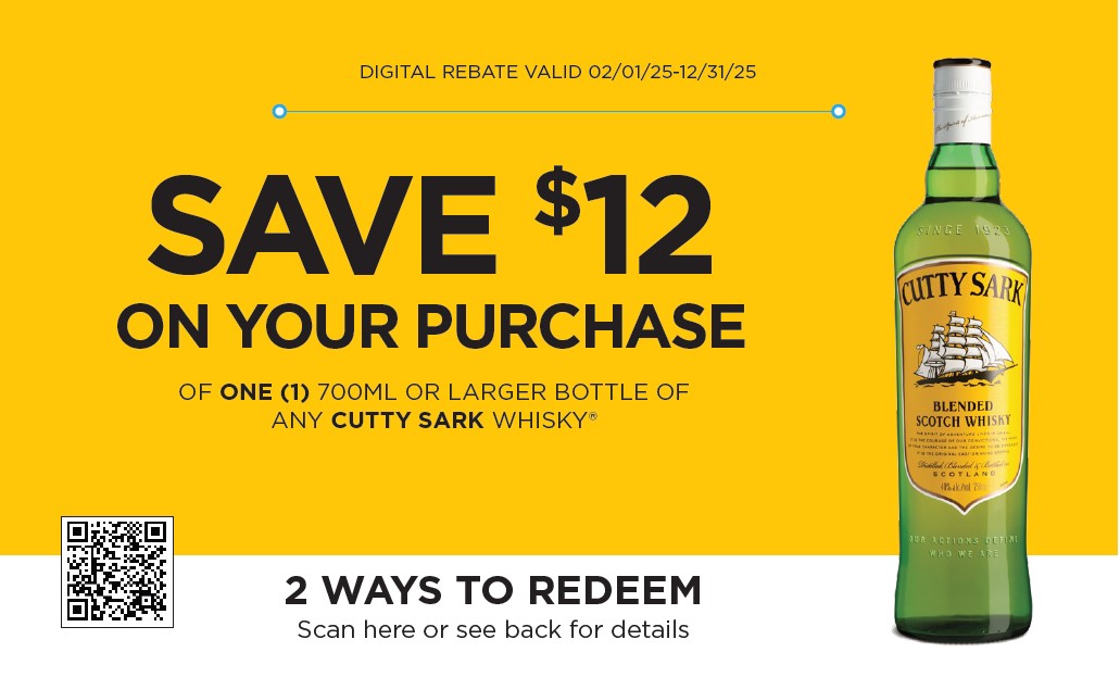 SAVE $12 ON THE PURCHASE OF ONE (1) 700ML OR LARGER BOTTLE OF ANY CUTTY SARK WHISKY®