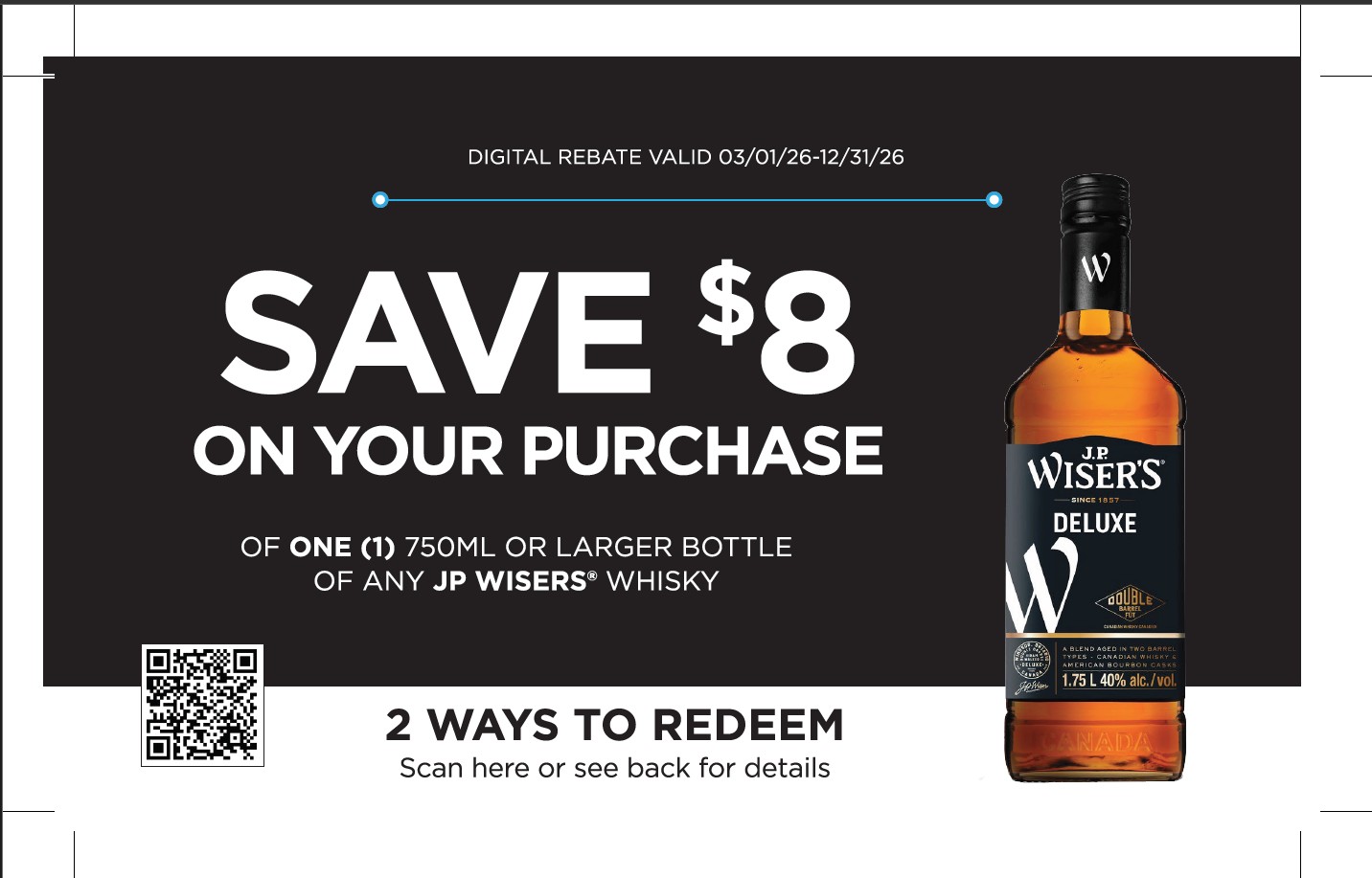 SAVE $8 ON THE PURCHASE OF ONE (1) 750ML OR LARGER BOTTLE OF ANY JP WISERS® WHISKY