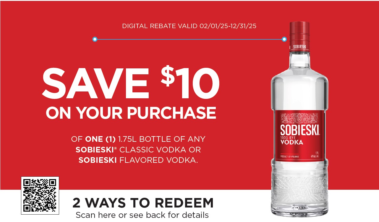 SAVE $10 ON THE PURCHASE OF ONE (1) 1.75L BOTTLE OF ANY SOBIESKI® CLASSIC VODKA OR SOBIESKI FLAVORED VODKA.